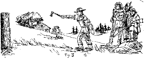 Take hold of your tomahawk as you would hold a tack hammer. The thumb should be at the side of the handle while the fingers are wrapped around the handle. (See Fig. 2) Point the hawk, cutting edge down, and the throwing arm fully extended towards the target. The throwing arm is then raised over the shoulder without fully bending the elbow. When the arm is brought down to a near horizontal position, (see Fig. 3) the fingers are opened for the release. At the moment of release, when the fingers are opened, the position of the hand is similar to the appearance of a hand being offered in a handshake. Be careful not to twist the wrist as this will make the hawk go somewhat sideways. Use mostly arm motion and a minimum of wrist action. Don't try to throw too hard. The average hawk, if sharp, will almost stick of it's own weight. Power, speed and more important, accuracy will come with time and practice.