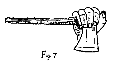 As a man is familiar with the possibilities of his rifle, so should he be familiar with the possibilities of his tomahawk. It is a tool and he should seek as many uses as he can for it. If kept properly sharpened, one can easily field dress and skin a big game animal with a hawk. The pelvic bone problem is solved with a flip of the wrist. In skinning, a natural for the hawk, the poll is held in the hand with the handle sticking out on side or the other. (See Fig. 7) It's obvious use as a hatchet for chopping or splitting wood needs no explanation. The poll can be used, to some degree, as a hammer. My hawk poll is kept somewhat flat for that purpose. If you have a spike-hawk, you have a built-in pick. Of course, any hawk can be used as a digging tool in an emergency. Hawks have even been used as paddles. The many uses of the tomahawk are limited only to the user's imagination.